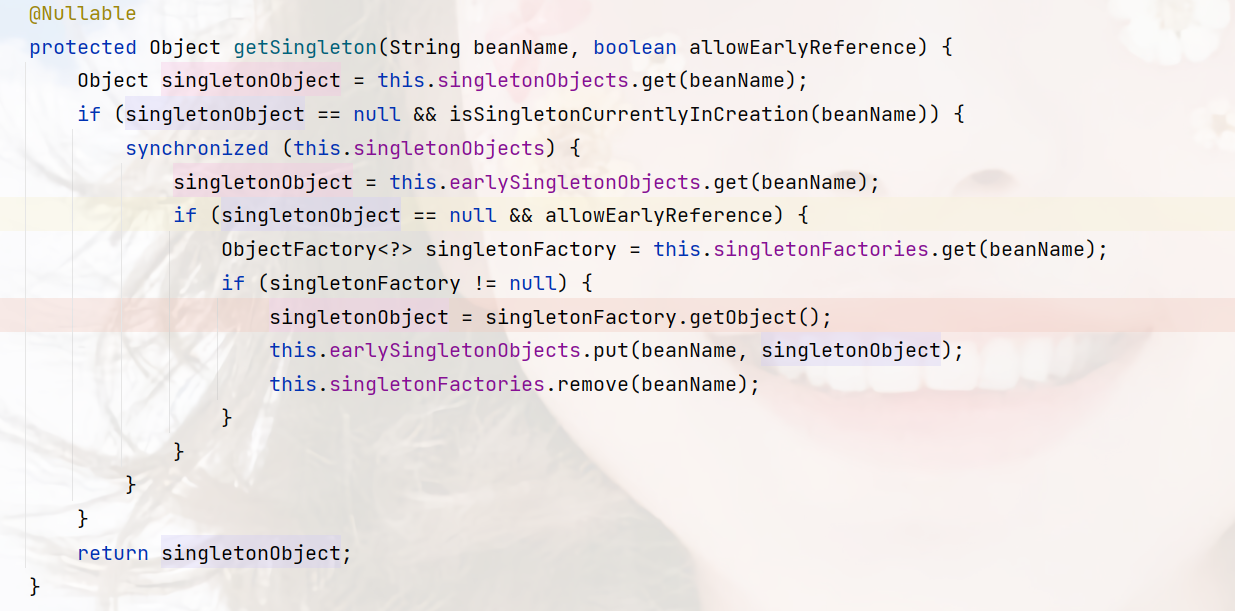 protected Object getSingleton(String beanName, boolean allowEarlyReference) {