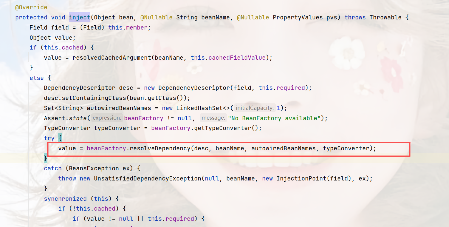 位置:org.springframework.beans.factory.annotation.AutowiredAnnotationBeanPostProcessor.AutowiredFieldElement#inject