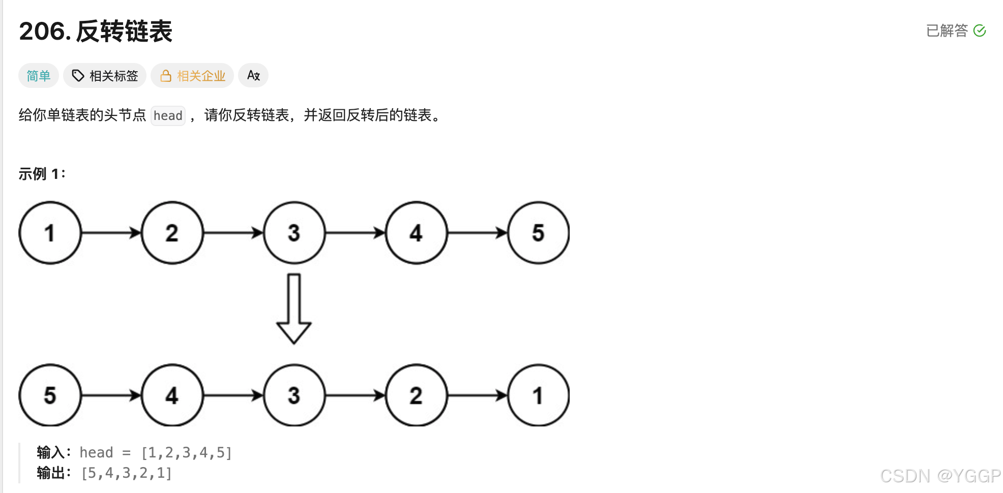 反转链表,顾名思义,我们要做的就是将给定的链表进行翻转。题目当中的输入只有一个头节点,因此我们默认尾节点就是nil。我们定义两个节点,分别是curr和prev,来解决这个问题。