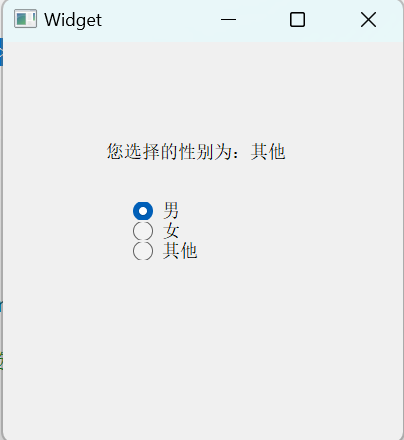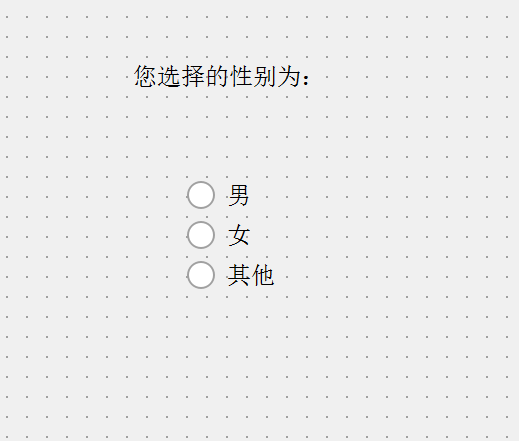 - 在界面上创建⼀个label,和3个单选按钮:设置的文本(您选择的性别为:)、3个单选按钮的objectName 分别为radioButton_male、radioButton_female 、radioButton_other