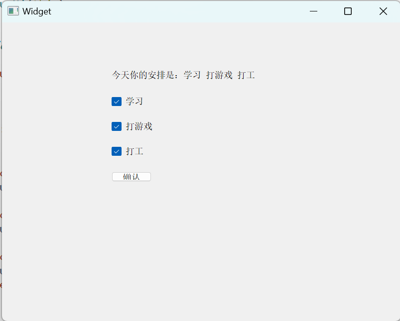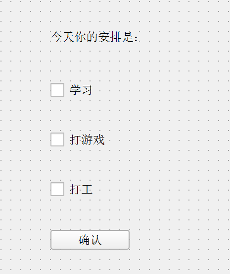 最终运行结果是,当点击选中学习、打游戏、打工,点击确认按钮,在label标签中会显示今日你的安排是:学习 打游戏 打工