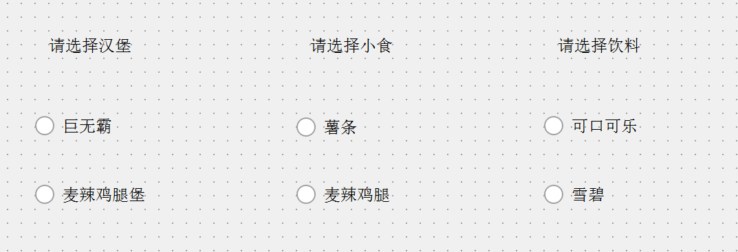 - 在界面上创建6个单选框用来模拟麦当劳点餐界面