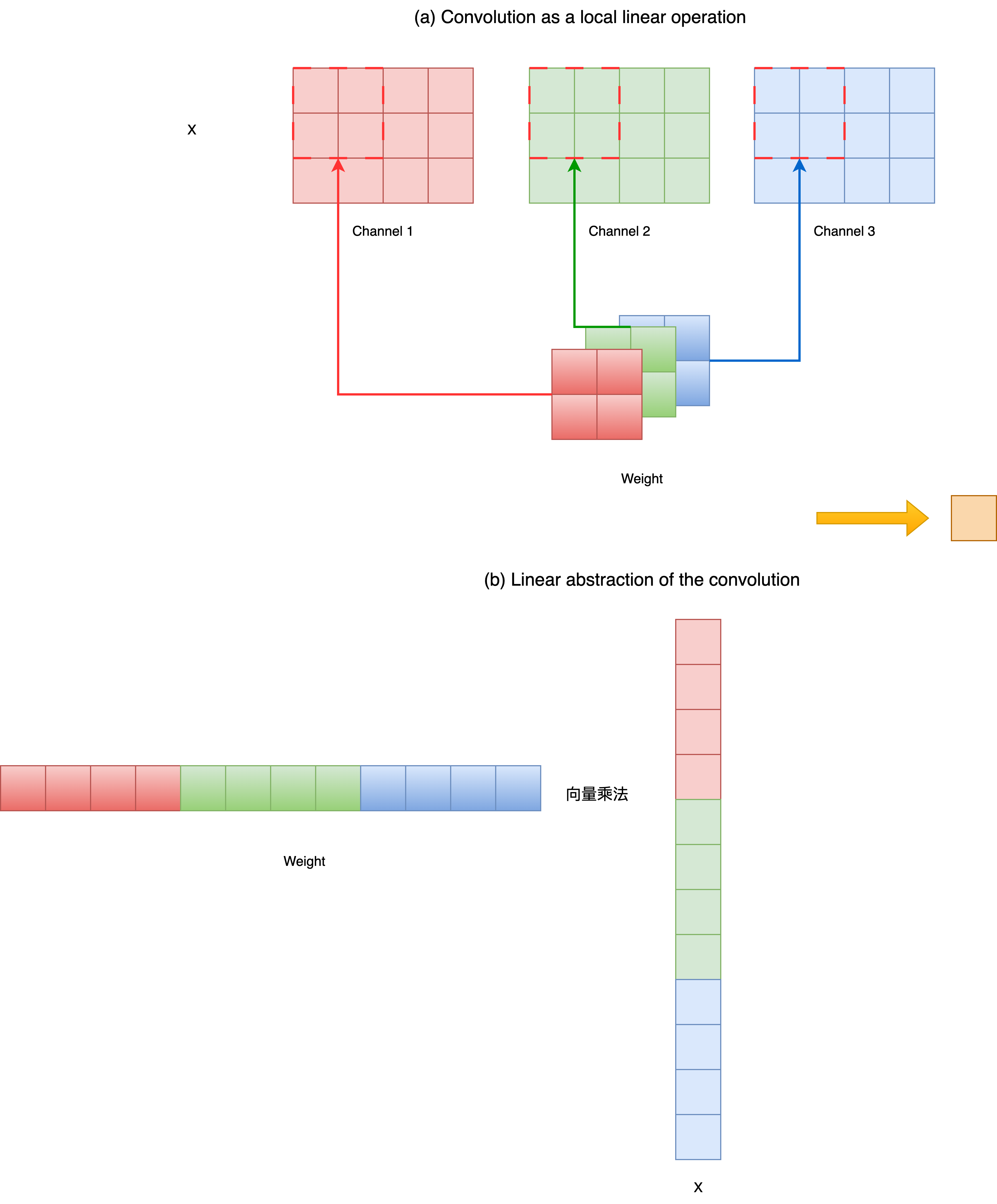 从线性代数角度看,每一个空间窗口,都可以被展开为一个向量,与对应的卷积核权重做一次线性映射。