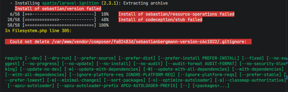 重点 将那个文件手动删除/var/www/vendor/composer/6360be3e/Codeception-Stub-4aaeffd/.gitignore: 这个是在docker中的文件路径