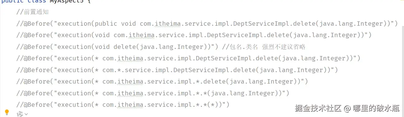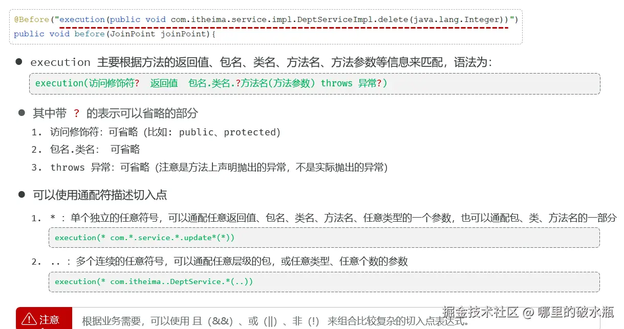 - 切入点:PointCut 表示要匹配哪些条件