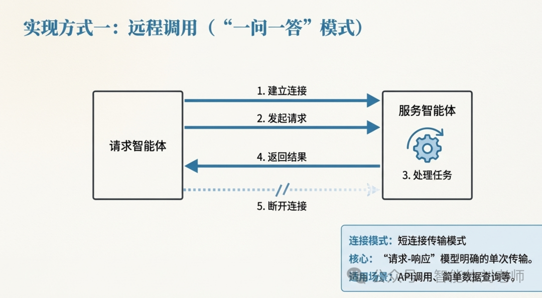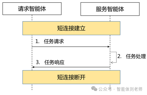此方式适用于智能体之间"请求-响应"模型明确的单次传输场景。