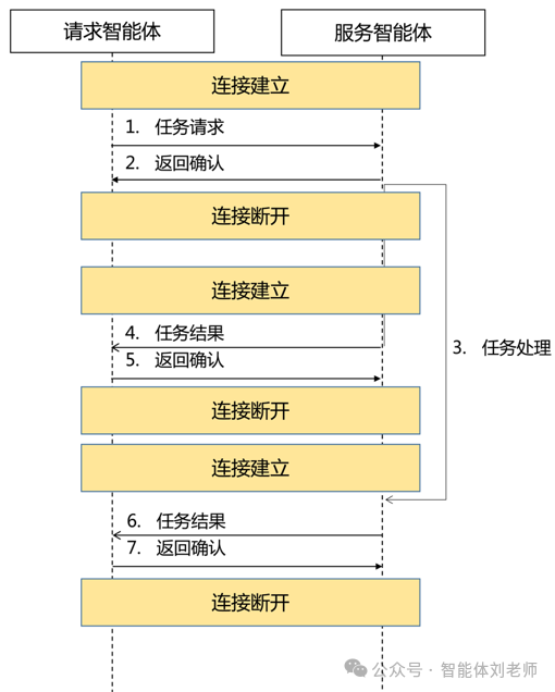 在任务处理过程中,当满足条件时,服务智能体与请求智能体建立新的连接,主动向请求智能体发送任务结果,请求智能体返回确认后,连接即断开。