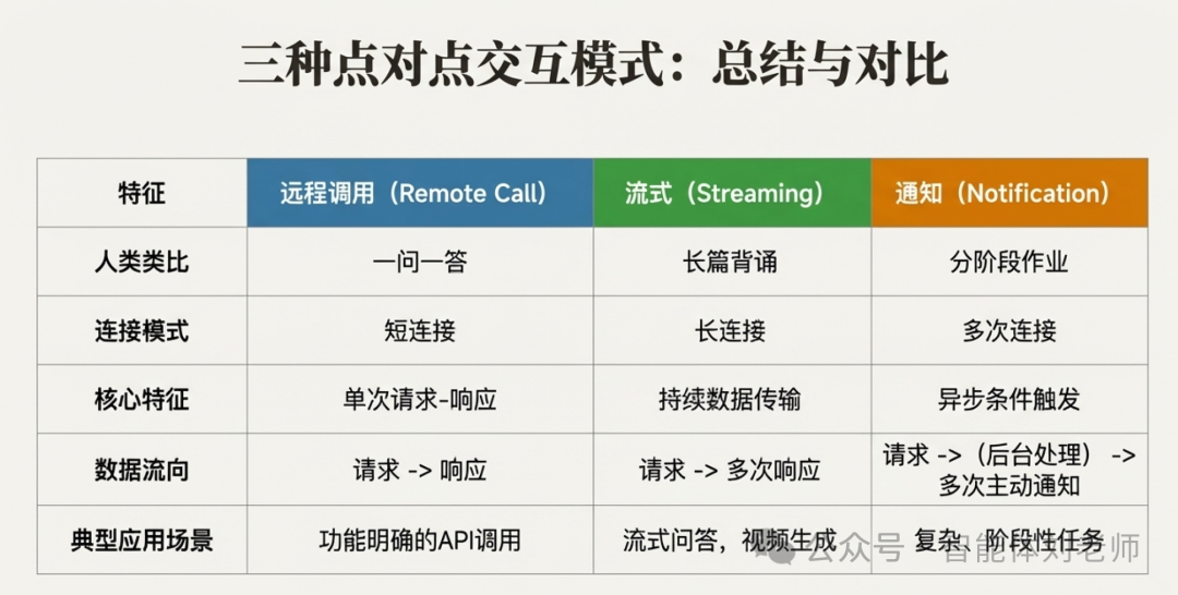 在上一篇,我们了解了智能体协作时的三种交互模式:点对点、群组、混合。下面我们一起来深入了解下点对点交互模式的三种实现方式:远程调用、通知、流式实现方式。
