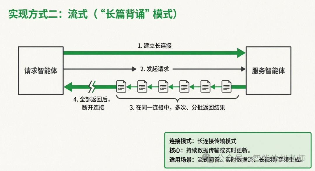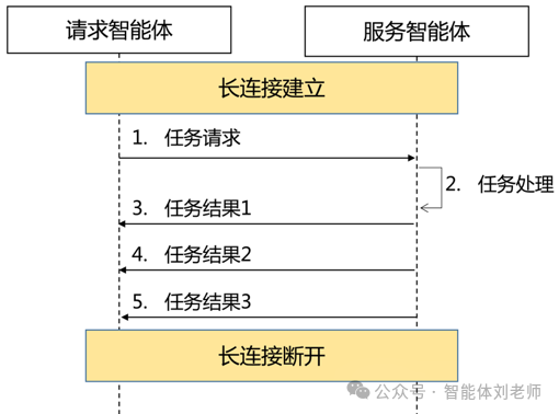 此方式适用于智能体之间需要持续数据传输(例如生成长视频)或实时更新(例如流式问答)的传输场景。