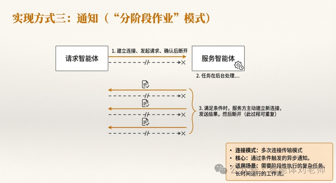 此方式适合智能体之间通过条件触发的异步通知传输场景(例如一个需要阶段性执行的复杂任务)。