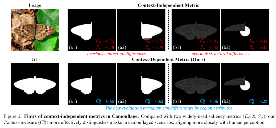 就像文档里的经典例子:两只形态完全相同的蝴蝶,红蝴蝶停在红枫叶上(完美伪装),蓝蝴蝶停在黄枫叶上(格外显眼)。但传统指标会因为两者的预测区域与标注区域重叠度相似,给出相近的分数,完全无视了"伪装"这一核心特性。