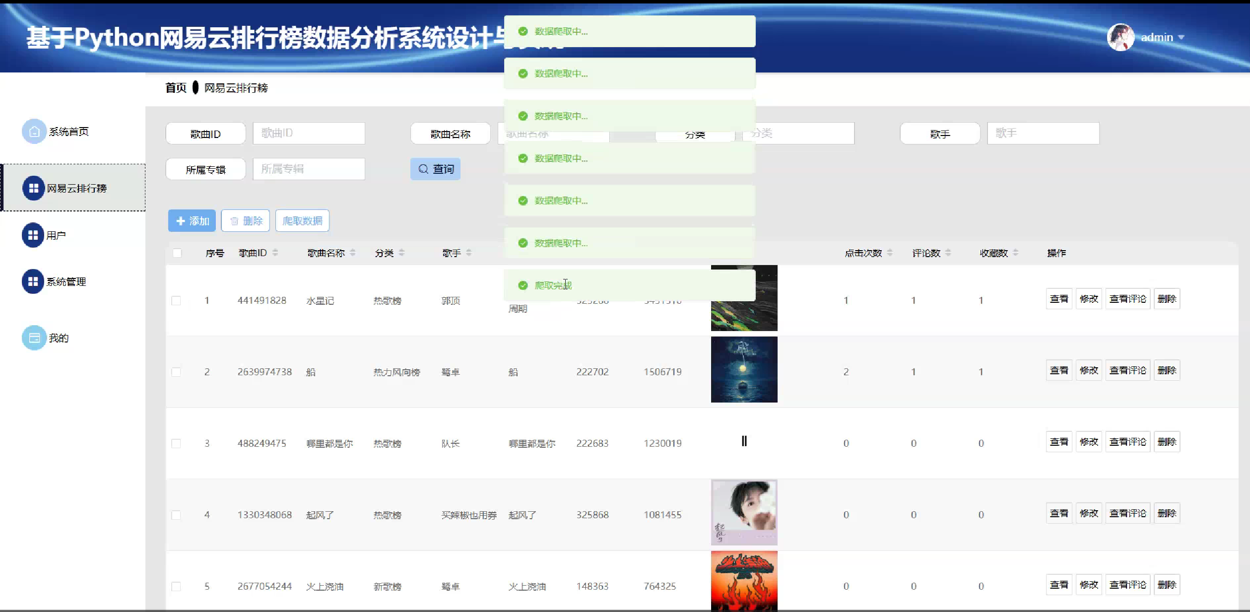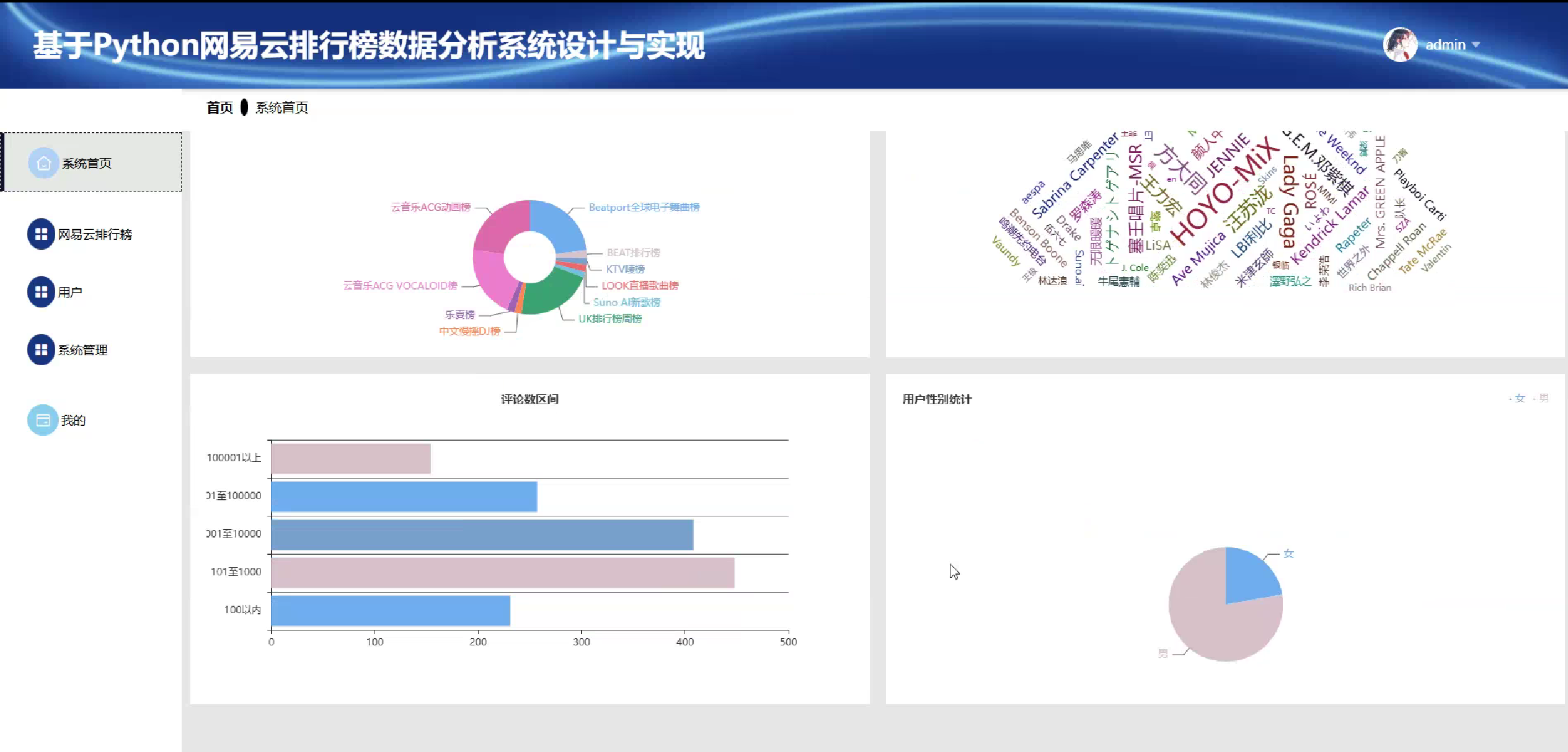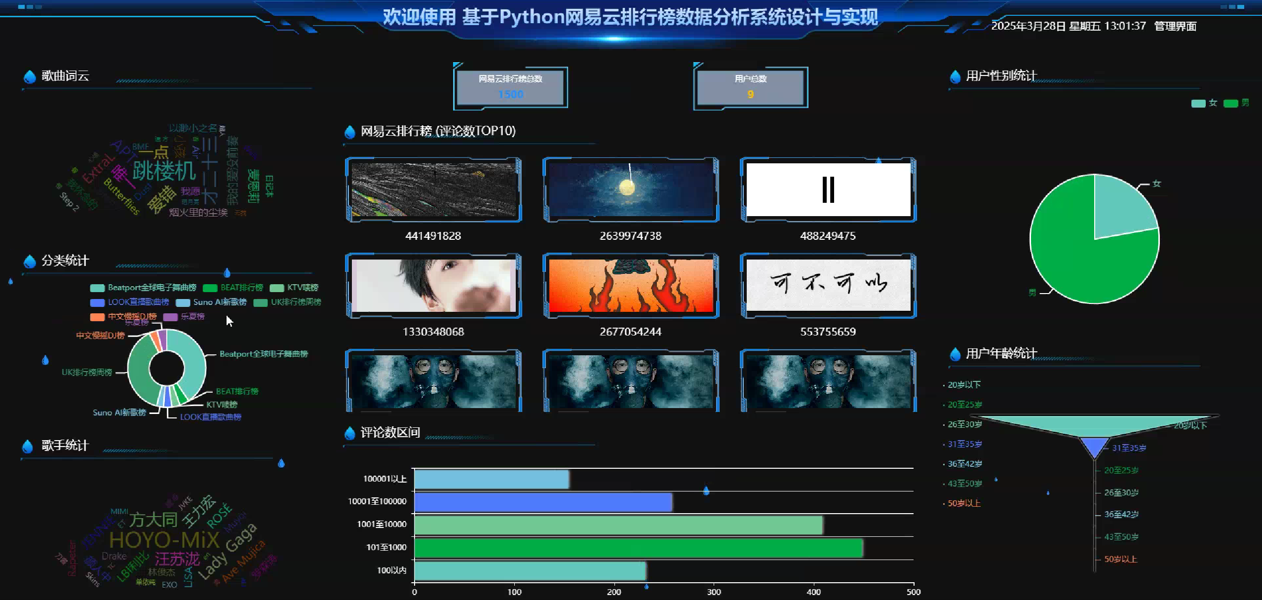 基于Python网易云排行榜数据分析系统设计与实现(源代码+数据库+论文+PPT+说明文档+部署讲解等)