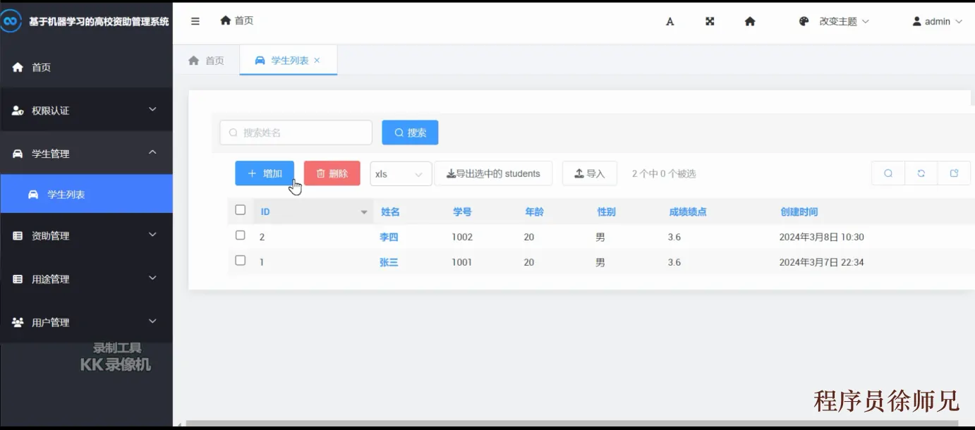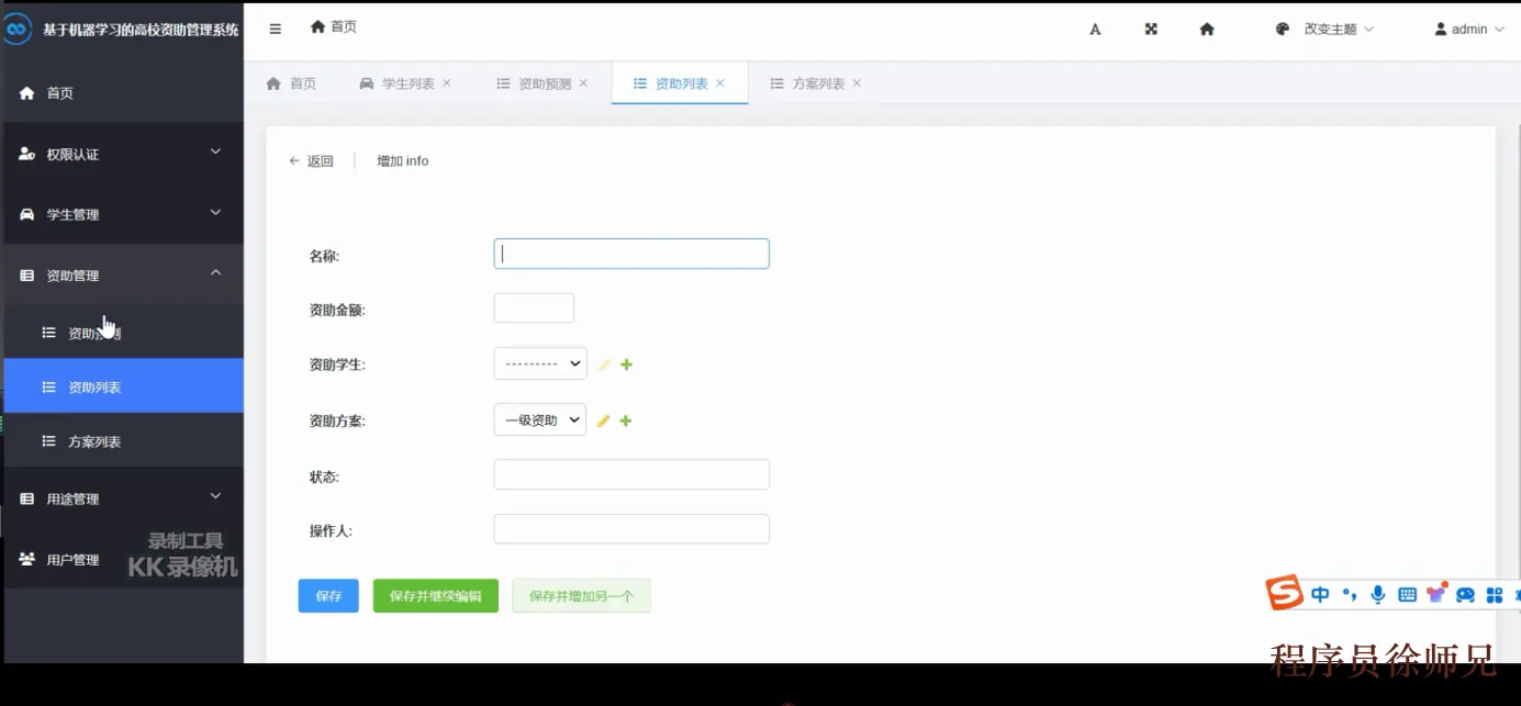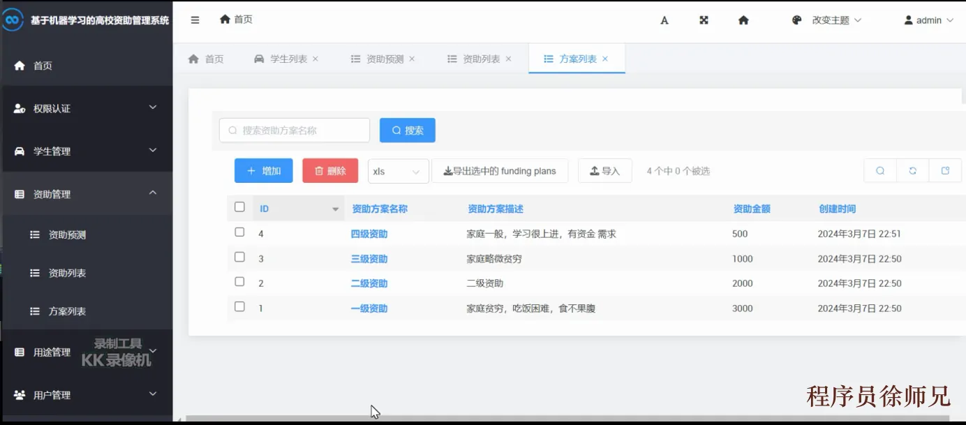 该模块提供了资助信息的录入、查询、修改和删除等功能,管理员可以根据具体资助项目进行分类和管理,同时支持资助信息的统计分析和效果评估。工作人员可以根据学生的情况使用数据挖掘和机器学习算法建模,为每个学生推荐最佳的资助方案,并监控资助过程,以确保资助的有效使用和最终目的的实现。如下图5.3所示。