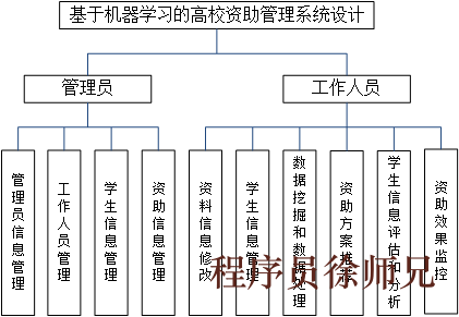 该高校资助管理系统的总体设计目标是为学生提供个性化的资助方案,并为管理员提供便捷的管理和监控功能。系统采用Python语言、Django框架和MySQL数据库实现,通过集成常用的机器学习算法如KNN、Naive Bayes、SVM和神经网络等,实现对学生信息的分析和预测[14],以及资助方案的推荐和监控。系统包括管理员和工作人员两类角色,管理员具有权限管理、学生信息管理、资助信息管理等功能,而工作人员主要负责学生信息的录入和修改。通过数据挖掘和处理技术,系统能够自动筛选、分类和整合学生的特征变量[15],帮助管理员准确判断学生的资助资格,并为他们推荐最适合的资助方案。同时,系统还具备资助效果的监控和评估功能,以保障资助的有效使用。整体上,该系统旨在提升高校资助管理的智能化水平,提高操作便捷性和决策效率,为学生提供更准确、个性化的资助支持。系统的总体设计图如下图3.1所示。