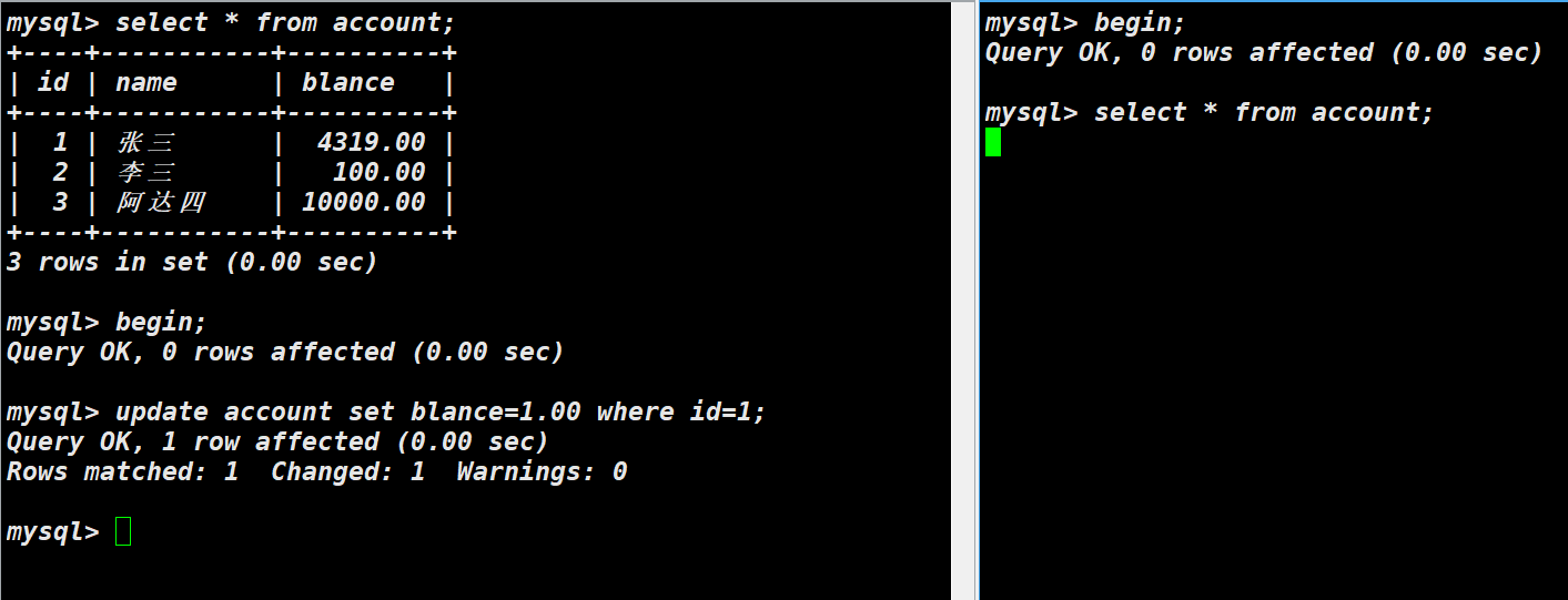 当我们对事务进行commit后,此时中断主机A,在主机B上查询表可以发现依然能看到commit前插入的数据。说明commit将数据永久保存在数据库中