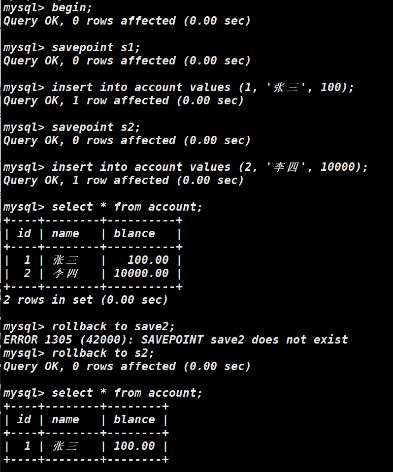 通过begin开始事务,commit结束事务,savepoint【名字】可以暂存点,rollback【名字】可以进行回档。
