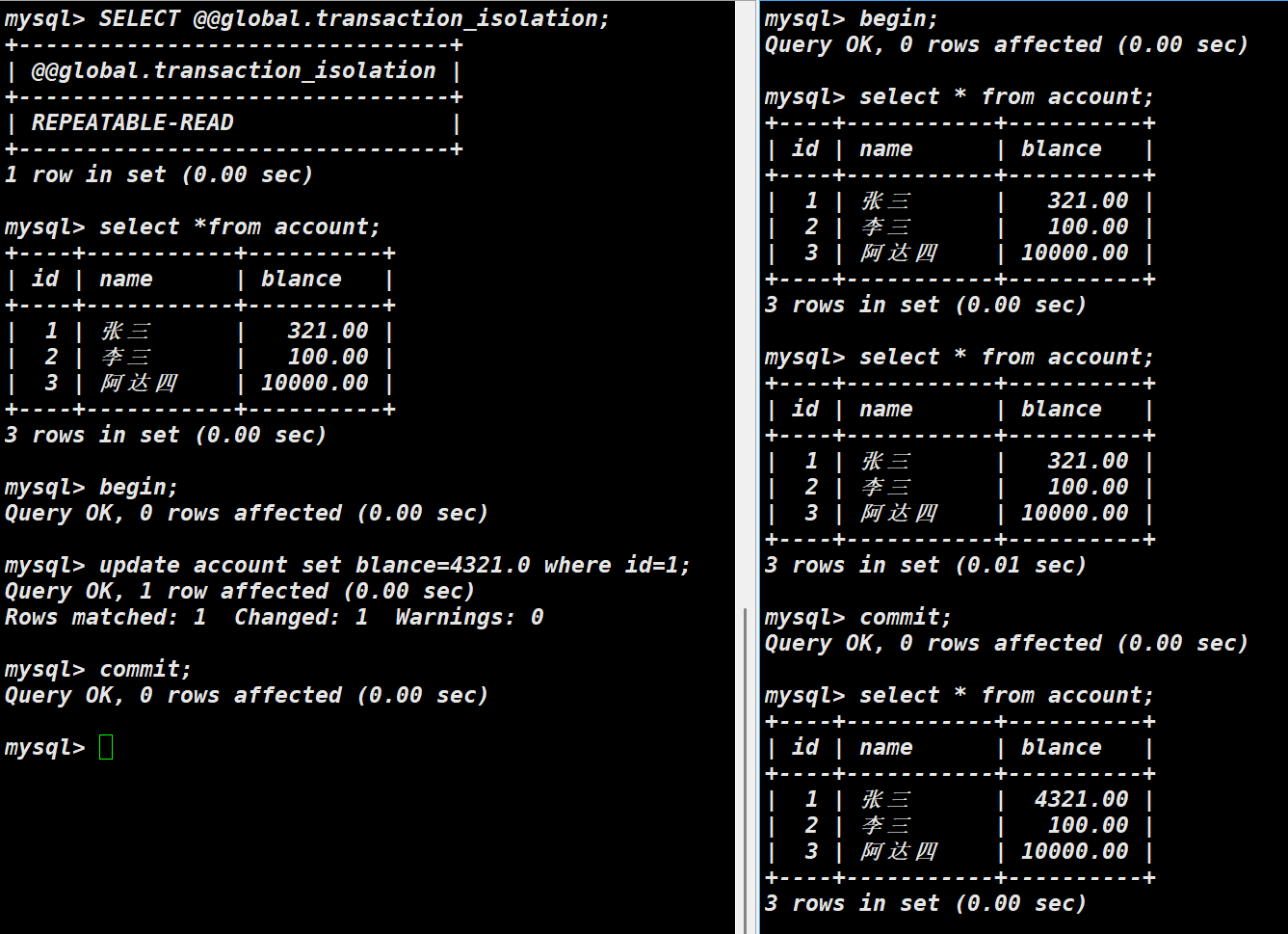 可重读读同时开启主机A和主机B的事务,主机A更改某列数据,此时主机B访问表发现表仍然为原先旧数据;主机A进行commit保存数据,主机B再次访问,发现仍然为原先数据;主机B进行commit保存数据,此时再进行访问表,表才进行了更新。