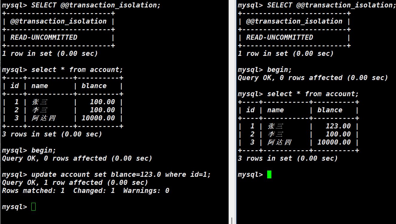 当我们使用读未提交时,主机A和主机B同时begin开始事务,主机A更新数据库一条数据,但是未commit,此时主机B访问表可以实时查看到数据被更改