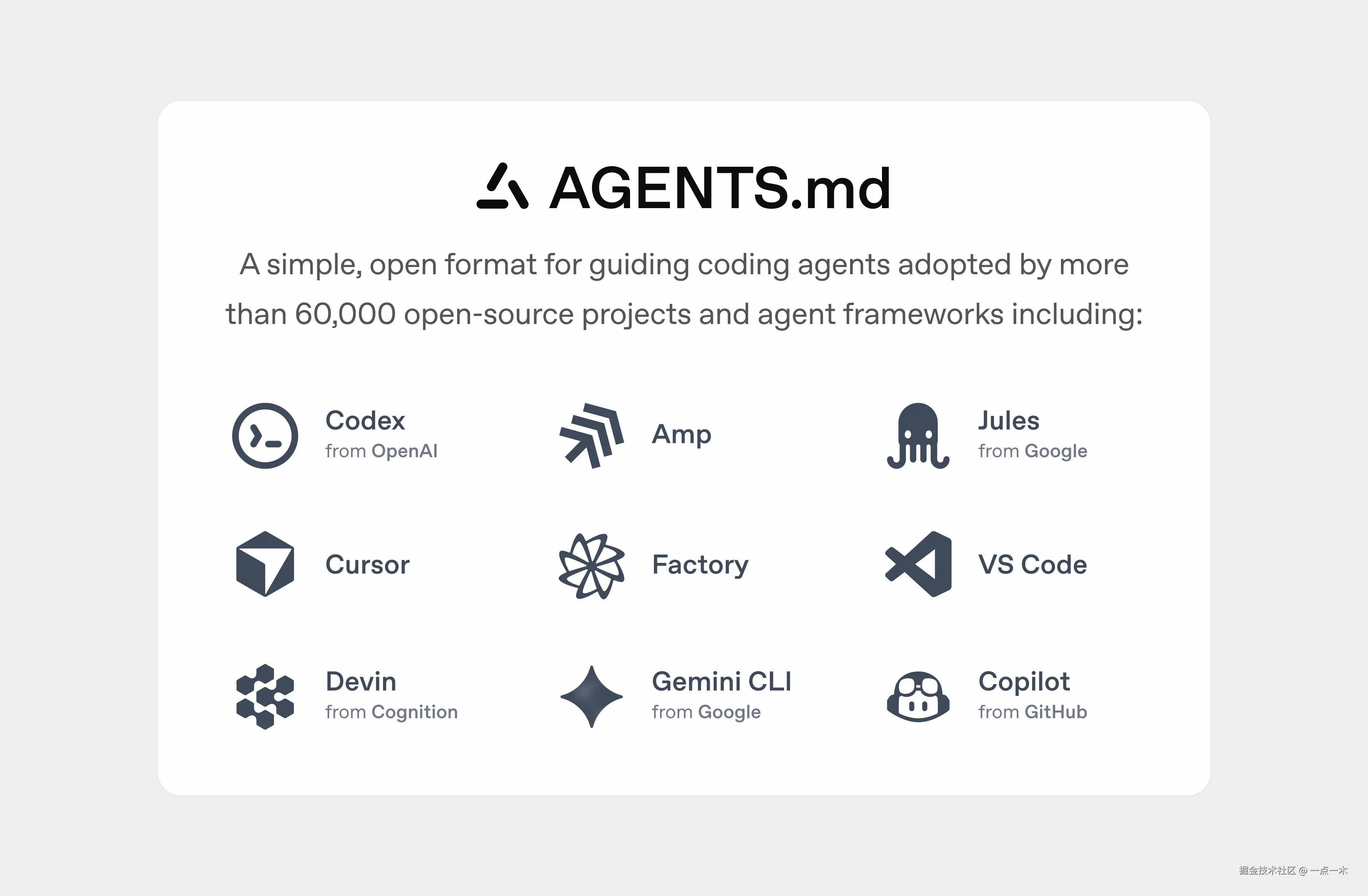 它将传统 README 中的人类阅读部分与机器导向的精确指令分离,通过可预测的位置和结构化内容,显著降低 AI 代理在陌生代码库中的摩擦,目前已配套官网示例和社区讨论,正在推动成为行业事实标准。