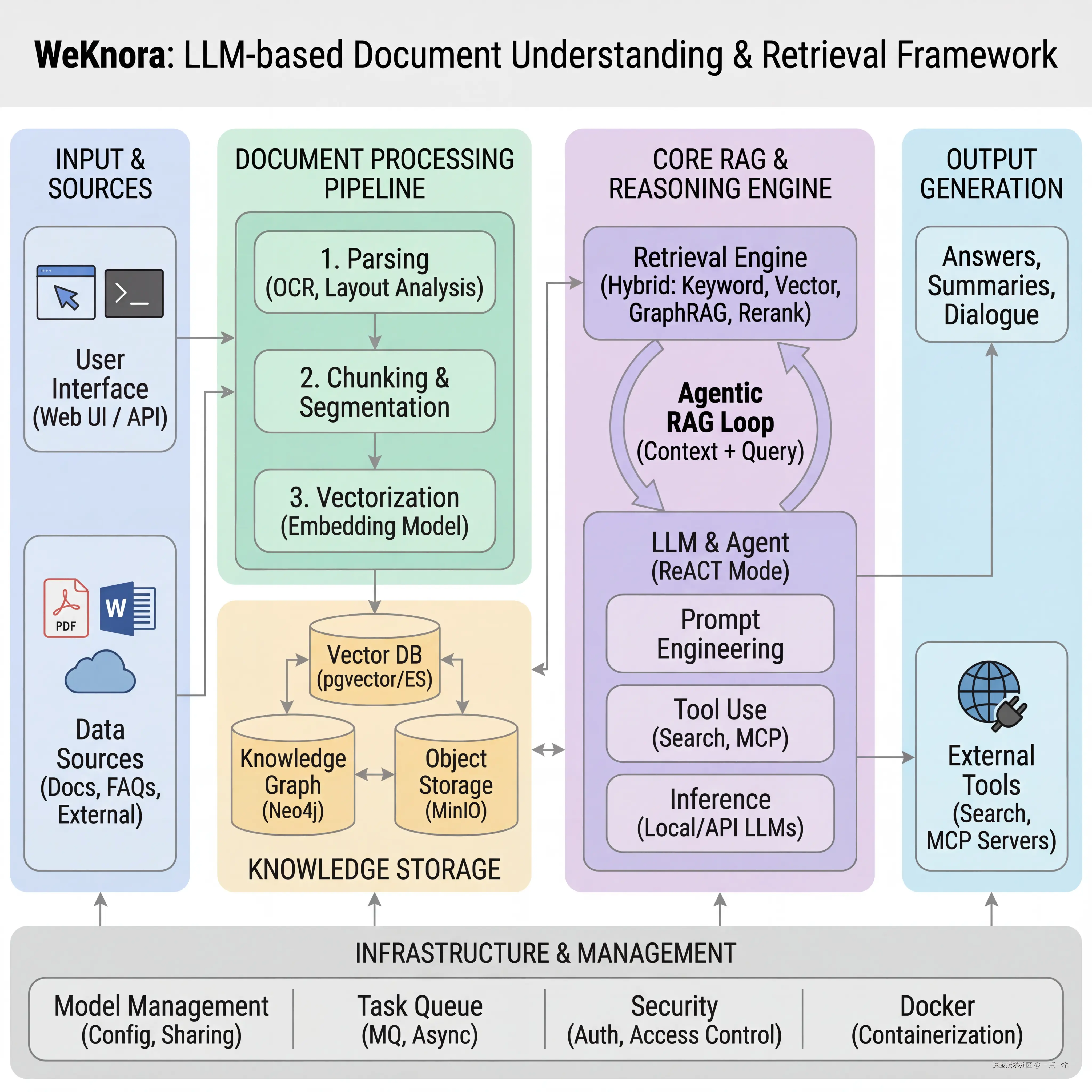 WeKnora 是腾讯推出的开源框架,专注于复杂异构文档的深度理解、语义检索与上下文感知问答,采用 RAG 范式结合多模态预处理、向量索引、智能检索和大模型推理,提供企业级知识管理解决方案。