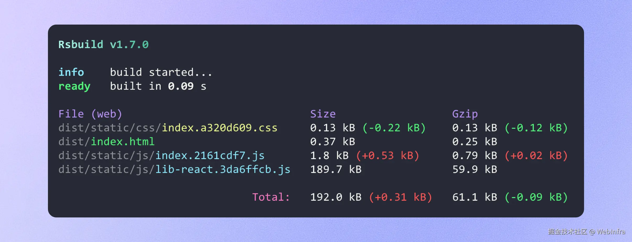 Rsbuild 现在支持输出产物体积对比,用来查看构建结果是否发生了体积变化。