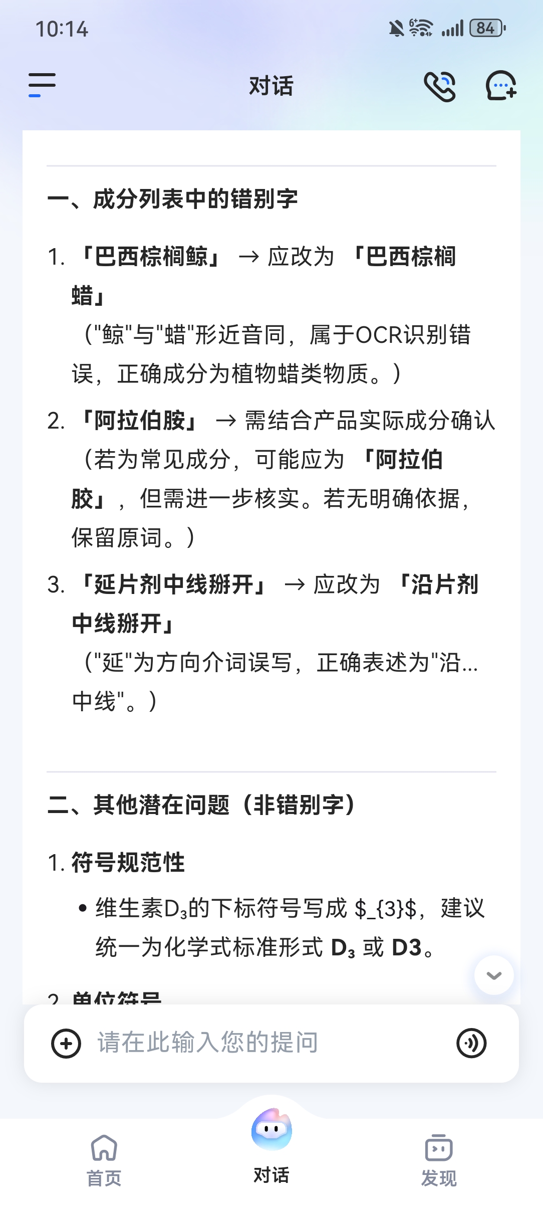 周末在家,随手拿起孩子正在吃的斯维诗钙片,竟在瓶身上发现一个错别字。试探着联系客服,很快有人接听并做了登记------响应速度值得肯定。接着顺手用AI检测了一下,星火大模型也识别出了这个错误。