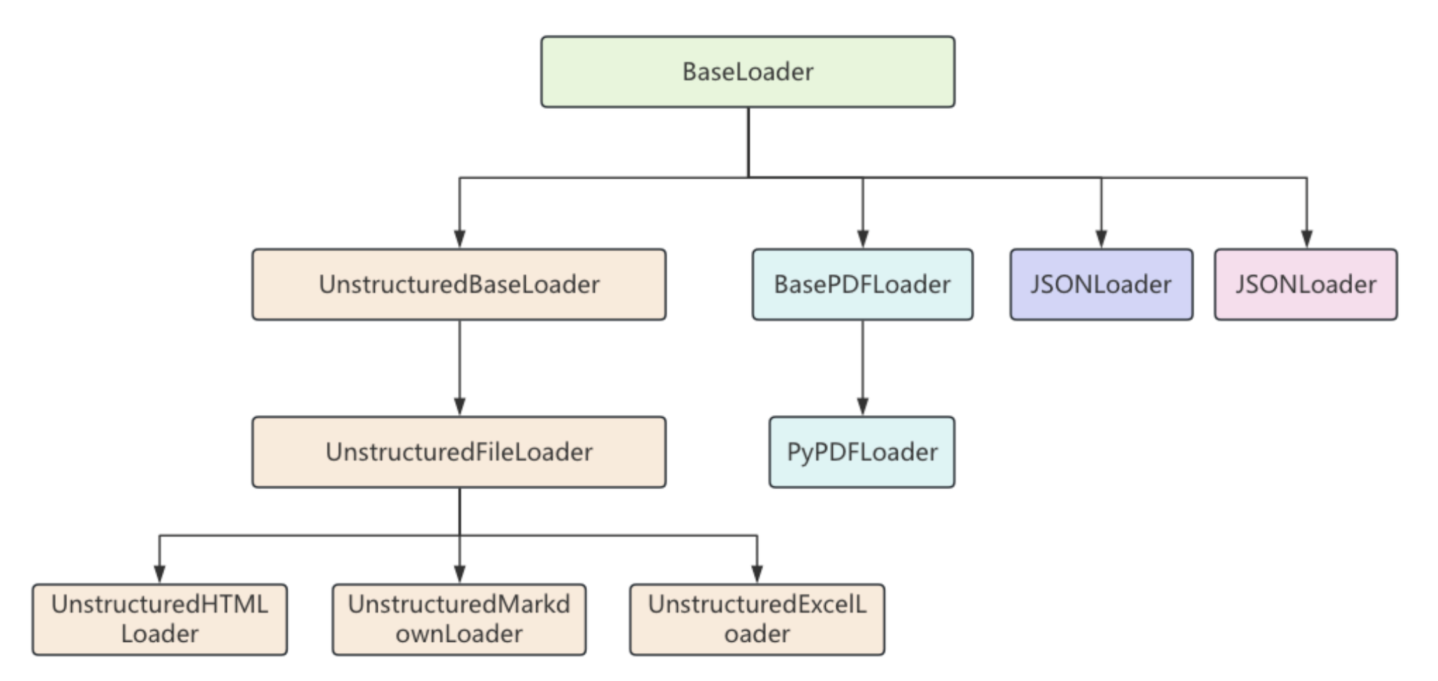 每一个文档加载器都有自己特定的参数和方法,但它们有一个统一的load()方法来完成文档的加载,load()方法会返回一个Document类的对象列表,因为这些文档加载器都继承自BaseLoader基类,它们的继承关系如下: