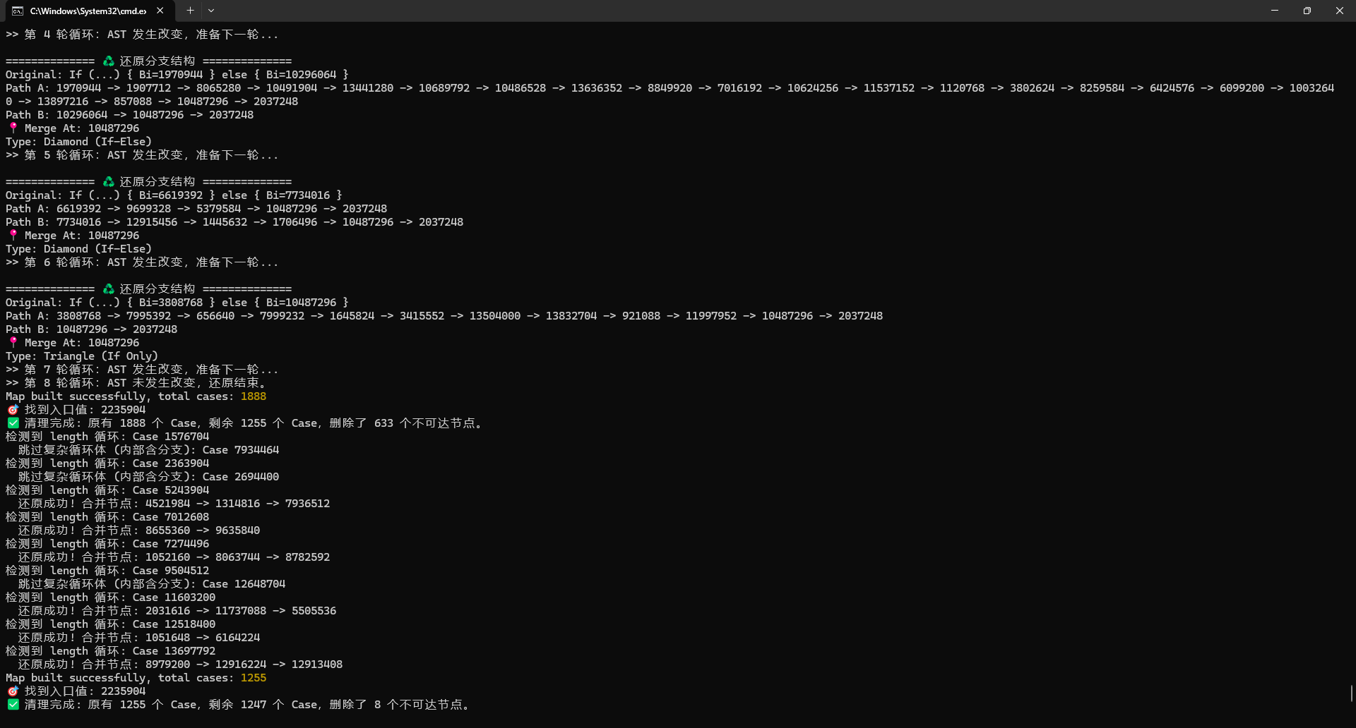 此时去分析代码你会你会发现剩下的case用图论去分析只有if/else结构,我也建议你在最后的还原成顺序结构时,先把代码中的所有循环解决,只留下if/else结构这样就可以很容易的还原成顺序结构。
