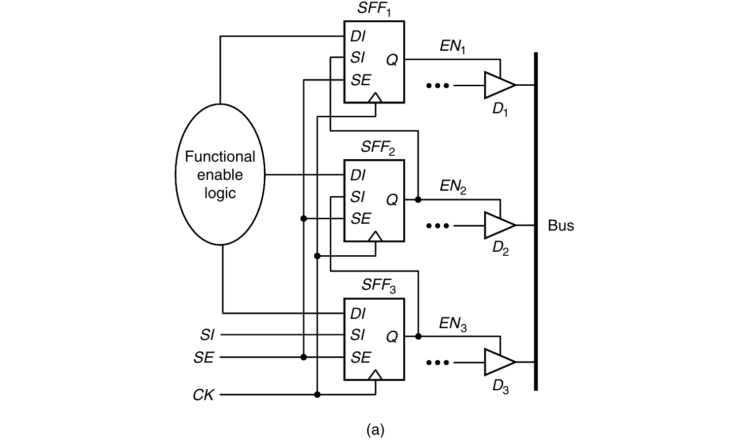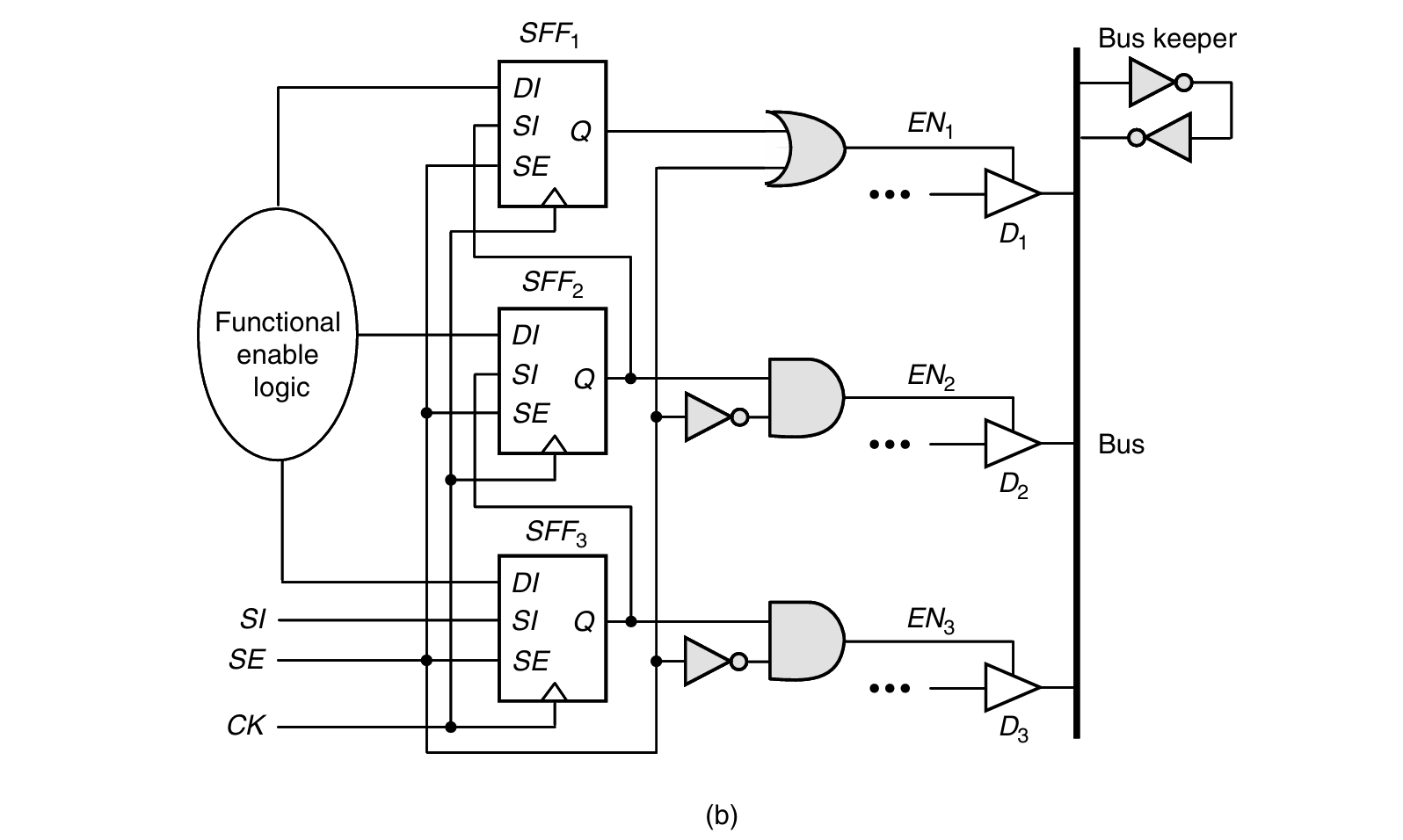 修正后的电路如下图b,SE = 1为shift mode时,EN1 = 1(使能D1),EN2和EN3 = 0(禁止D2和D3)(一次只允许一个驱动):
