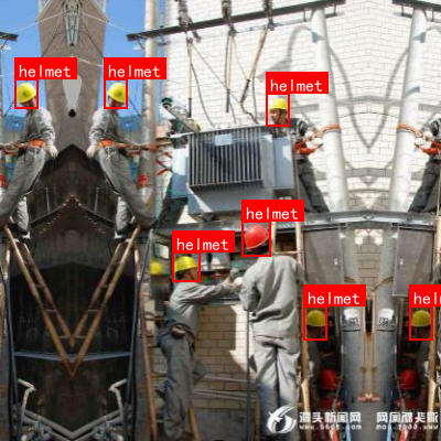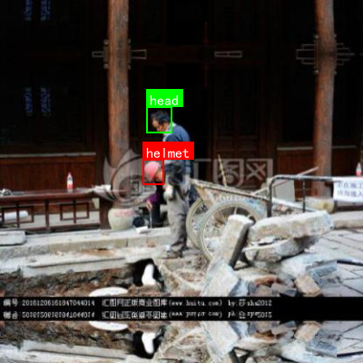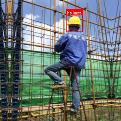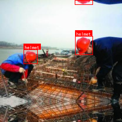 上图为系统实际部署效果图,展示了在复杂施工现场环境下,系统依然能够准确识别工人是否佩戴安全帽,并实时标记检测结果。
