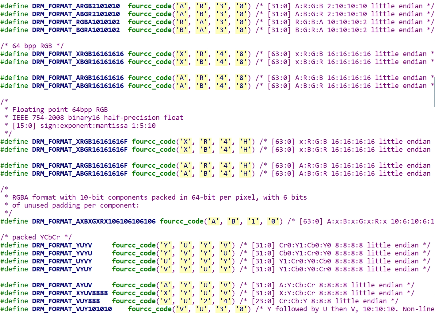 这些FOURCC编码格式并非一种标准化,因此只在DRM KMS子系统里是有效。