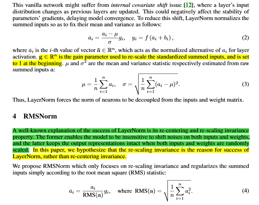 RMSNorm是LayerNorm的一种特殊情况。如论文绿色标识部分,LayerNorm是weights进行重中心化和缩放,减少模型对噪声的敏感度,提升模型的稳定性和鲁棒性。RMSNorm和LayerNorm不同的是RMSNorm只需要做缩放(re-scaling)不需要重中心化(re-centering),其中是训练参数(初始化为1),维度为hidden_size