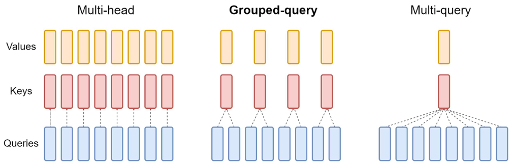 - GQA(Grouped-Query Attention):对query head进行分组,组内query head对应一个key head、value head