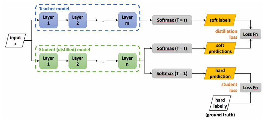- Teacher Model:基于输入x得到 Temperature=t 的软标签