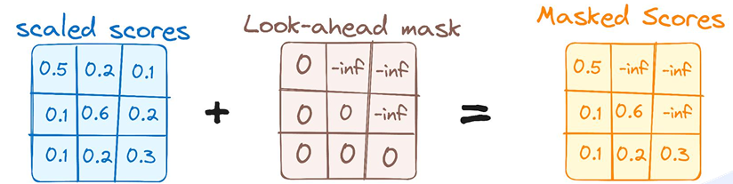 CausalLM(自回归模型,仅有decoder)在计算token相关度时,当前token只能看到"自己"和"之前"的token,所以需要将当前token之后的注意力分数进行mask,在计算softmax时,对应的注意力分数就是无限接近于0,图示如下: