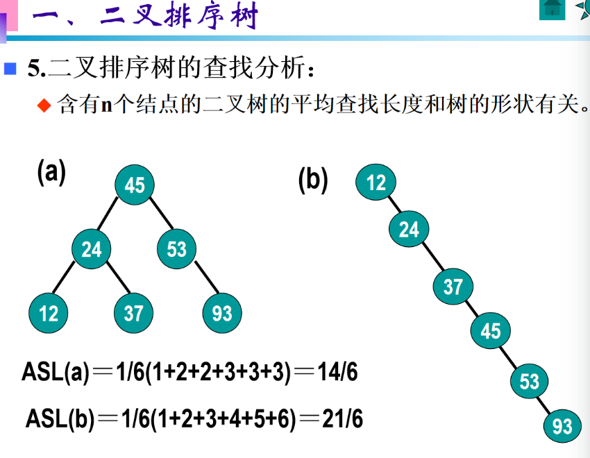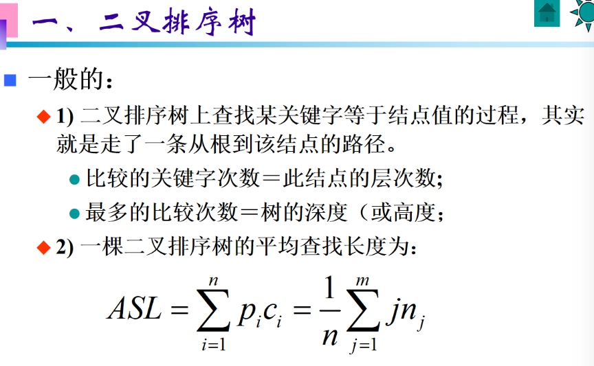 二叉排序树的平均查找长度(ASL)计算方法是:所有结点的查找长度之和,除以结点总数n。