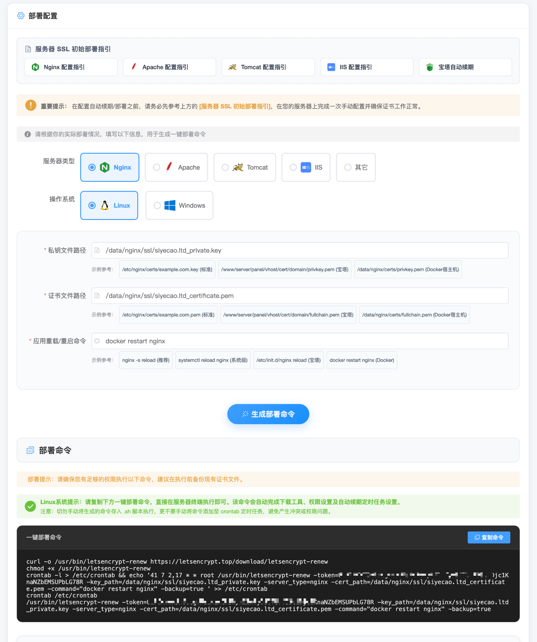 证书配置好后,回到乐此加密证书列表,点击对应域名的 "自动续期" 按钮。 根据指引填写私钥路径、证书路径、重启命令,生成一键部署命令,复制到服务器执行。