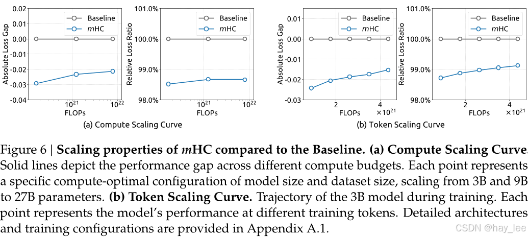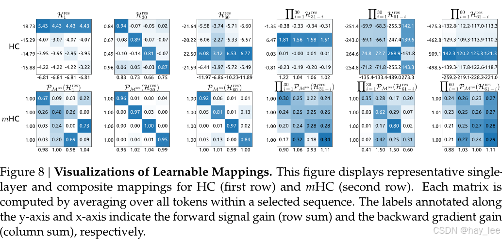 结果:mHC 的复合信号增益被控制在 1.6 倍 ,远低于 HC 的 3000 倍,逼近理想恒等映射的稳定性。