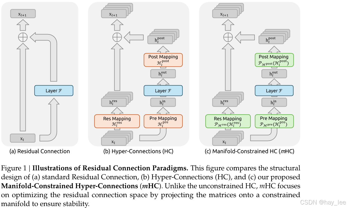 然而,随着模型规模扩大,研究者开始探索更复杂的连接拓扑。Hyper-Connections(HC)便是代表之一------它将残差路径扩展为多通道、多映射的高维结构,通过可学习的线性变换重组输入与输出特征,显著提升模型表达力。