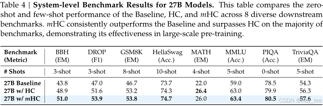 mHC 在 8 项关键基准上全面超越 HC 和 Baseline: