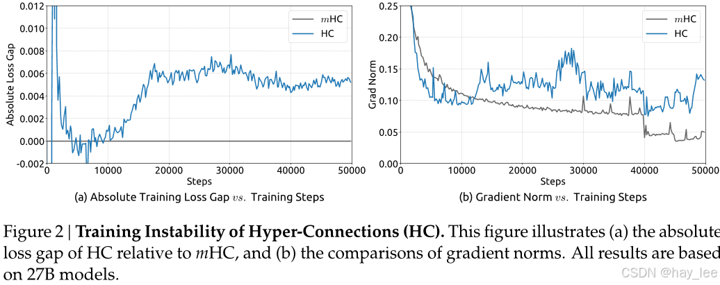 HC 训练中损失剧烈震荡;mHC 则平稳收敛,梯度范数稳定,无爆炸现象。