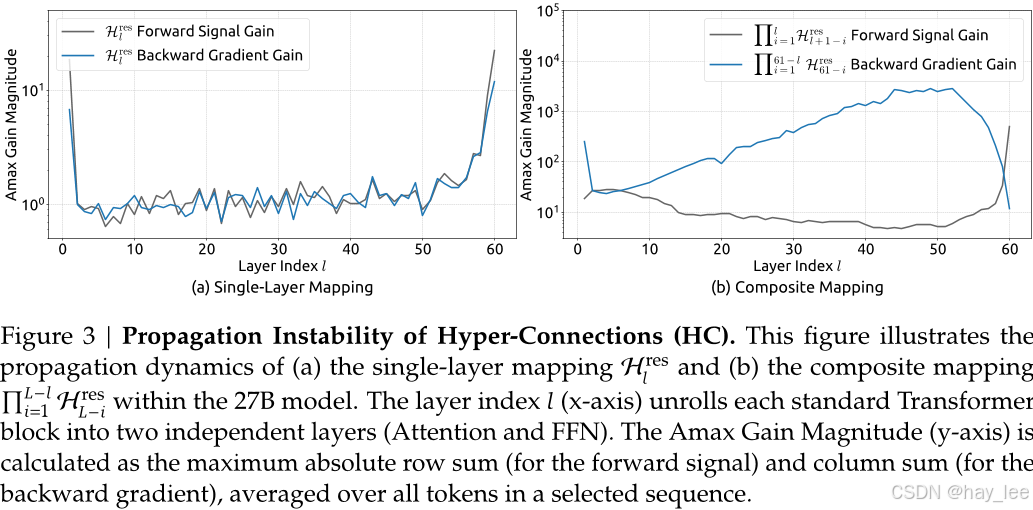 但代价是:HC打破了恒等映射约束 。DeepSeek 实验发现,在 27B 参数模型中,HC 的残差映射在反向传播时可将信号放大近 3000 倍,导致严重梯度爆炸、训练损失震荡甚至发散。同时,HC 还带来更高的 GPU 显存占用与通信开销,限制其在超大规模场景的实用性。