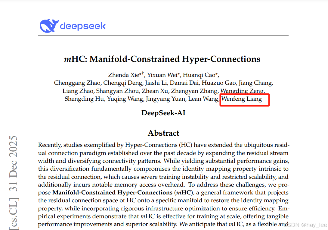 12月31日晚间,DeepSeek团队发布了一篇新论文,提出了一种名为mHC(流形约束超连接)的新架构。该架构解决了传统超连接(Hyper-Connections, HC)引发的信号爆炸与梯度不稳定问题。
