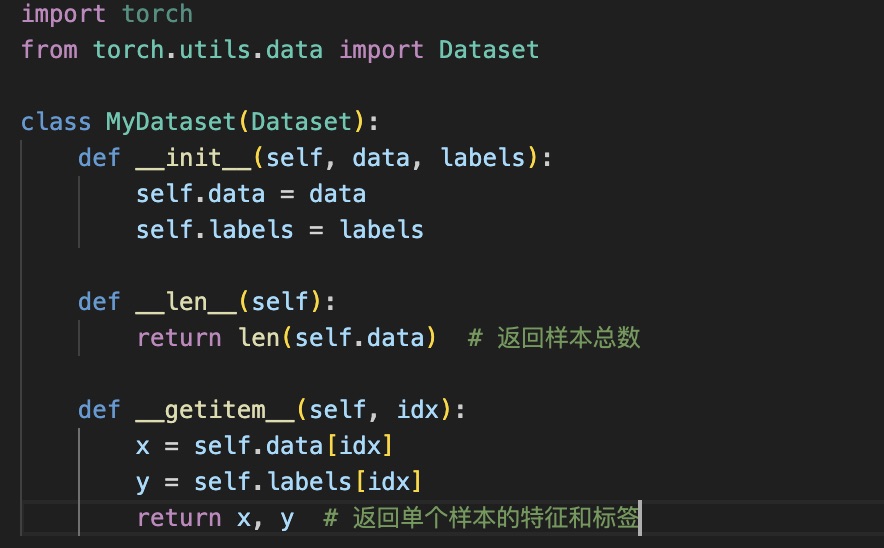 Dataset是 PyTorch 中封装数据的抽象类,需自定义子类并实现两个核心方法。