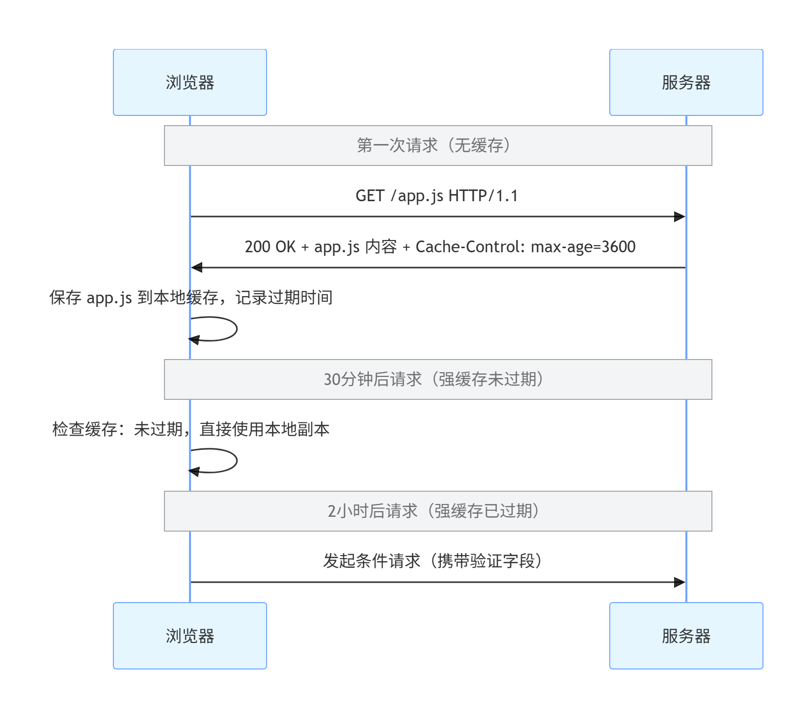 - 条件请求阶段 :24 小时后,强缓存过期 → 浏览器发送 GET 请求,携带