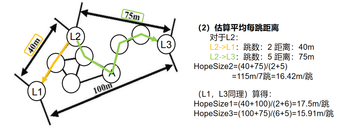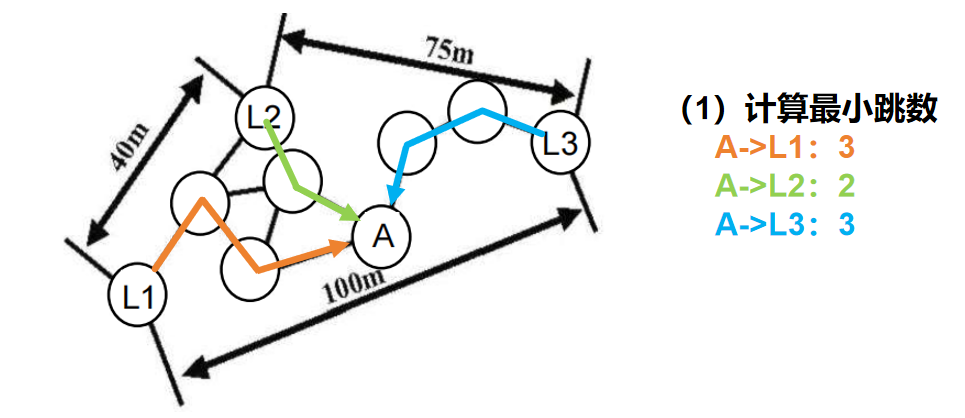 (2) 锚节点L1,计算得到的平均每跳距离为__17.5__米;(保留小数点后1位)