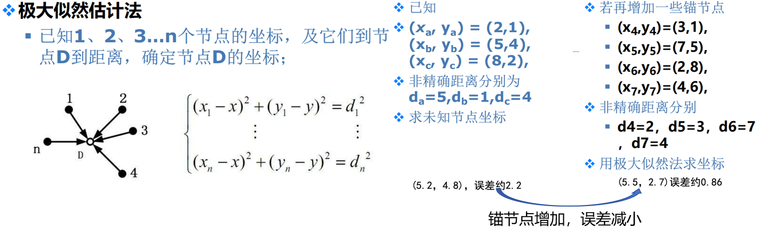 - 优点 :对测量误差有较好的容错性,精度随锚节点数增加而提高。