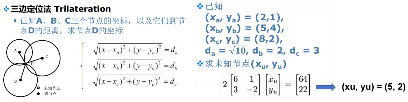 - 原理 :已知三个锚节点坐标 (xi,yi)(x_i, y_i)(xi,yi) 及到未知节点D的距离 did_idi,解方程组: