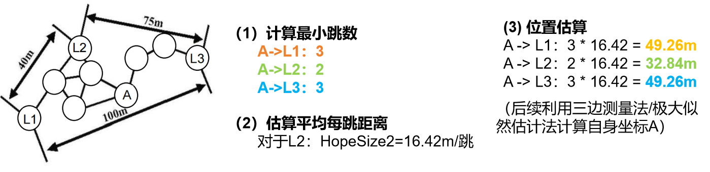 原理 :通过跳数和平均每跳距离 估算节点间距离,再利用三边或极大似然法定位。