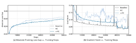 ▲论文配图HC与mHC的训练损失差距,其中淡蓝色线为HC,蓝色线为mHC。论文截图